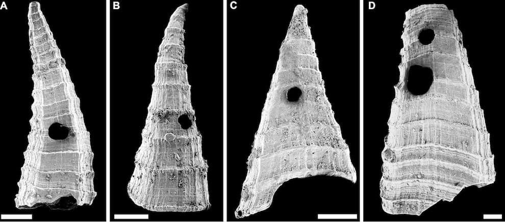 نمونههایی از صدفهای Lapworthella fasciculata (زیر میکروسکوپ الکترونی) از تشکیل مرنمرنا، درههای فلیندرز، استرالیا جنوبی، نشاندهنده سوراخهایی هستند که توسط یک شکارچی سوراخکننده ایجاد شدهاند. مقیاسها نشاندهنده 200 میکرومتر هستند. اعتبار: ر. بیکنل و همکاران (2025) Current Biology