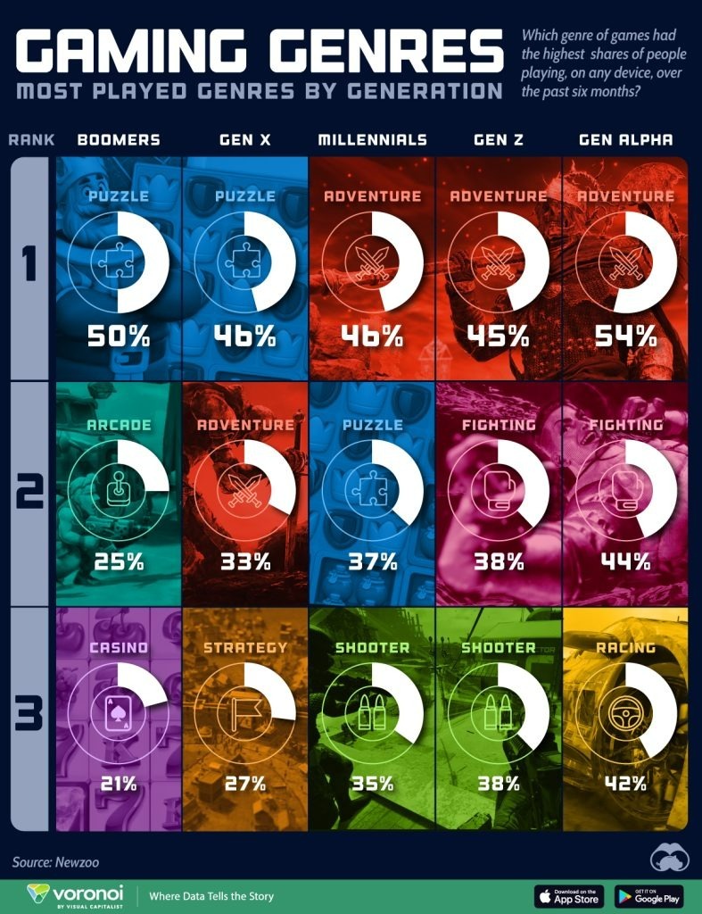در سه نسل جوانتر (آلفا، Z و هزاره)، بازیهای ماجراجویی مانند Skyrim، The Last of Us و Baldur’s Gate 3 بیشترین محبوبیت را دارند، در حالی که دو نسل قدیمیتر (X و بیبیبومرها) بیشتر به بازیهای پازلی و فکری مثل Candy Crush گرایش دارند.