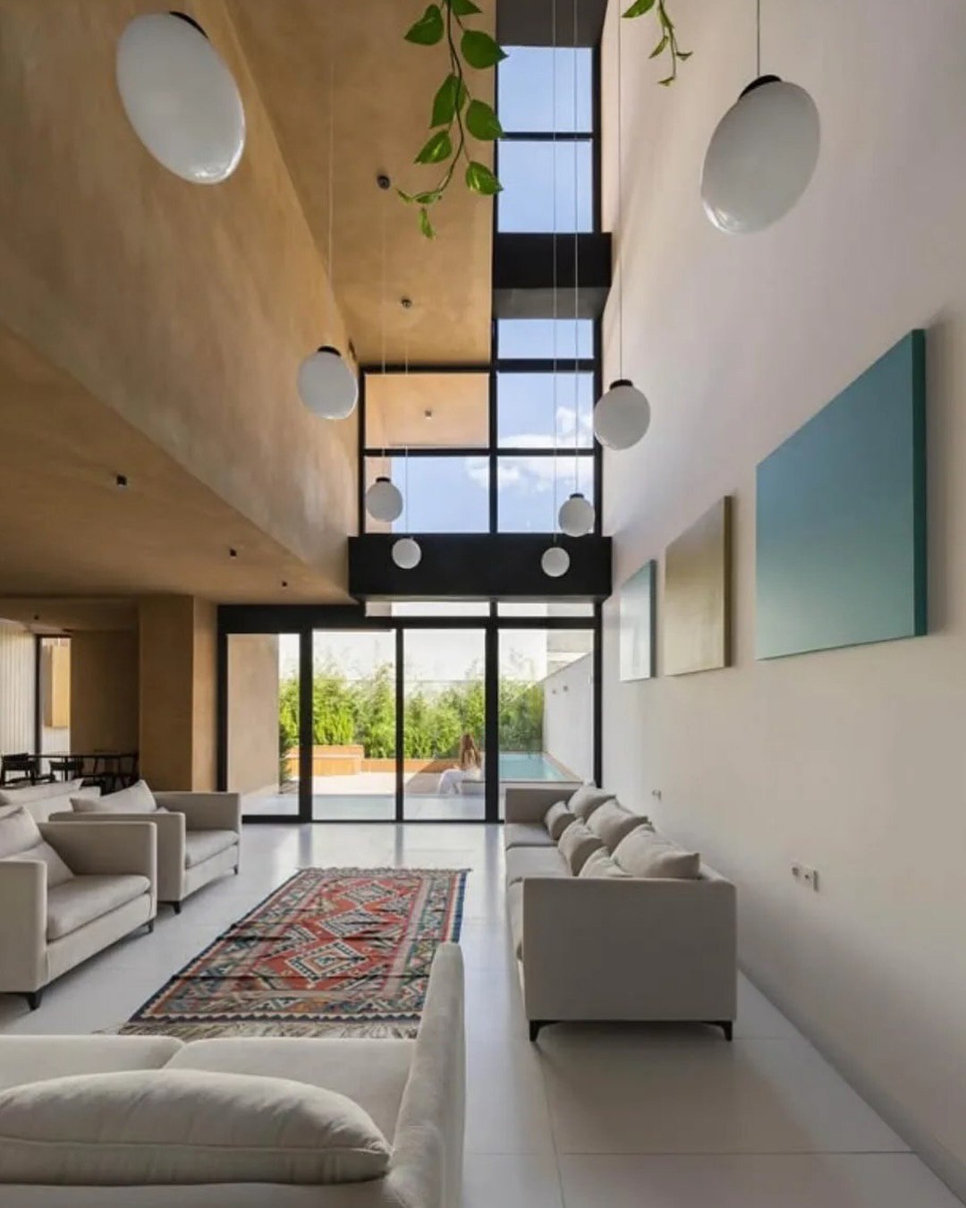 در فضای داخلی، اتاق نشیمن با ارتفاع سقف دو برابر، به صورت بصری به سمت حیاط و استخر امتداد یافته و جریان مداومی از نور و حرکت را خلق میکند. سطوح با رنگهای خاکی، استفاده از مصالح بومی و نور طبیعی فراوان، در مجموع تجربهای گرم و مدرن از زندگی در اقلیم خشک را ارائه میدهند؛ خانهای که در عین سادگی، صمیمی و شاعرانه است.