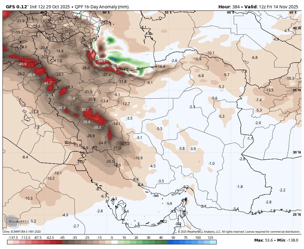 به گزارش تابناک به نقل از هواشناسی، الگوهای آنومالی بارش نشان میدهند که وضعیت کمبارشی شدید همچنان در ایران و همچنین سایر کشورهای خاورمیانه ادامه پیدا کرده و شرایط عجیبی را خواهیم داشت