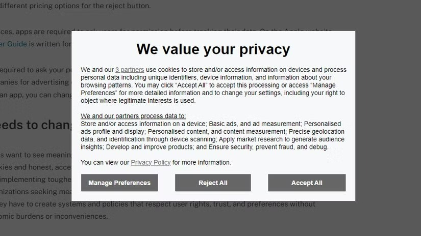 با وجود برجسته‌سازی دکمه Accept All Cookies، بیشتر بنرهای رضایت کوکی گزینه‌هایی مانند مدیریت کوکی‌ها یا سفارشی‌سازی را نیز ارائه می‌دهند. با استفاده از این گزینه‌ها، می‌توانید فقط دسته‌بندی‌های کوکی‌های ضروری را فعال نگه دارید و کوکی‌های تبلیغاتی، تحلیلی و شبکه‌های اجتماعی را غیرفعال کنید.