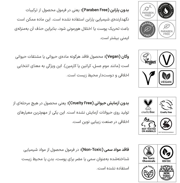 • Cruelty-Free (بدون آزمایش حیوانی): یعنی هیچ‌یک از مراحل تولید یا مواد اولیه روی حیوانات آزمایش نشده‌اند. با این حال ممکن است محصول شامل مواد حیوانی مانند موم عسل یا لانولین باشد.