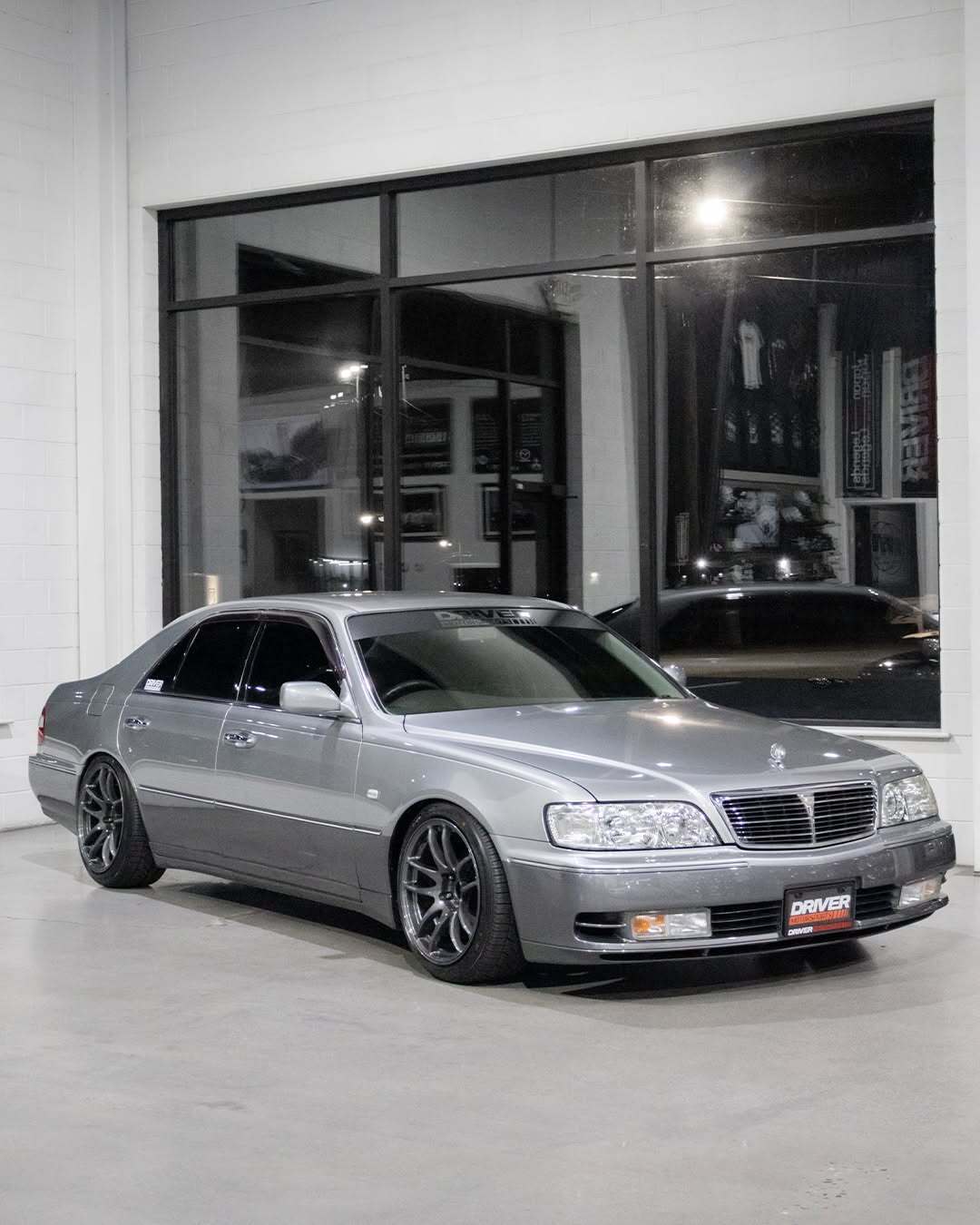 تصویری از نمای خارجی یا داخلی یک دستگاه نیسان سیما Y33 مدل ۱۹۹۹ به رنگ سفید یا نقره‌ای، که یک سدان لوکس JDM با رینگ‌های ۱۸ اینچی Work Cr Kai و فنربندی BC Racing است و موتور توربوشارژ V6 دارد.