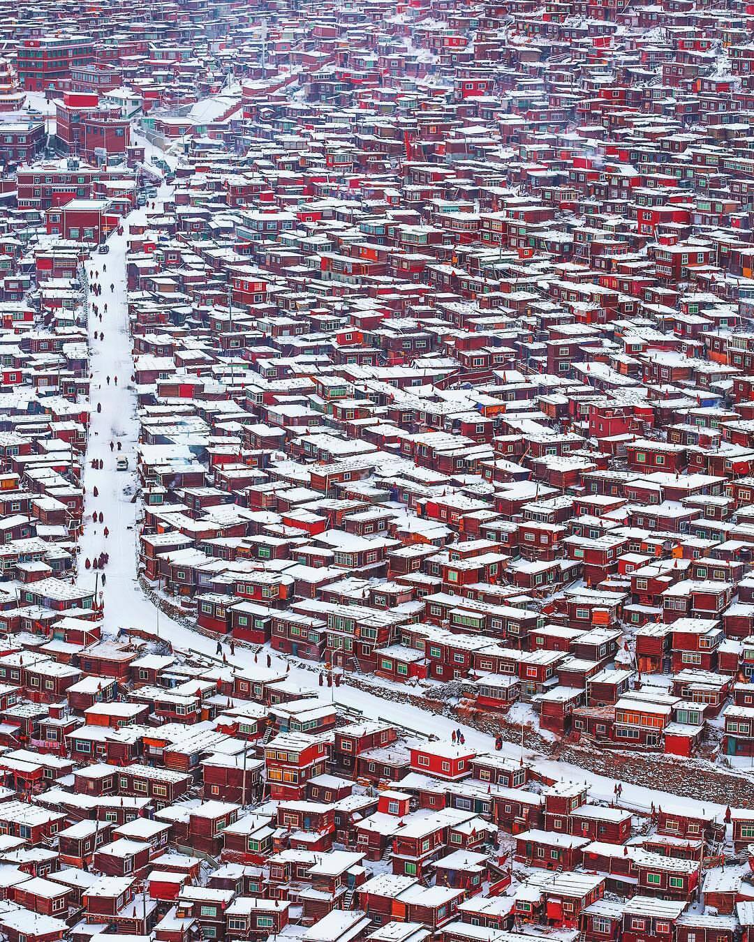 تصویر هوایی از نمای گسترده آکادمی بودایی لارونگ گار در شهرستان سِردا استان سچوان، هزاران خانه‌ی چوبی کوچک و سرخ‌رنگ را در تراکم بسیار بالا در دامنه‌ی یک تپه کوهستانی نشان می‌دهد. سقف خانه‌ها پوشیده از برف سفید است و یک جاده برفی باریک از میان این ساختار متراکم عبور می‌کند.