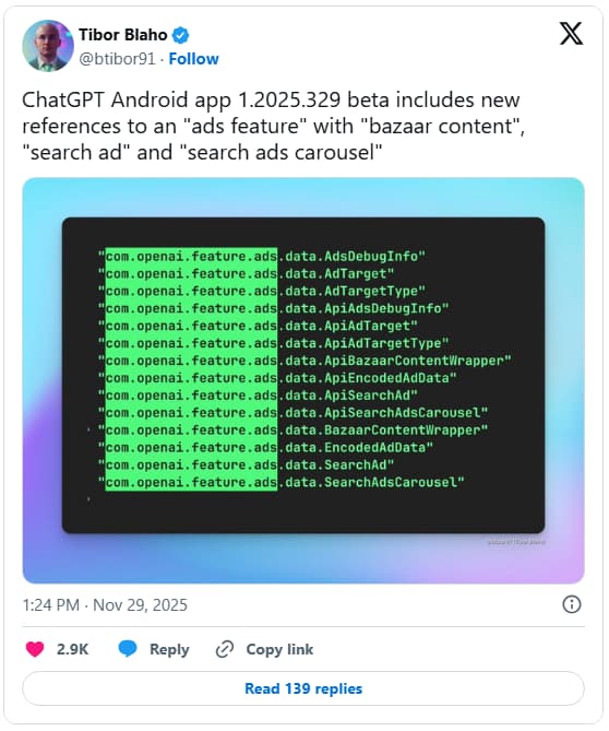 نخستین نشانهها از طریق تیبور بلاهو در ایکس دیده شد. او در نسخه بتای 1.2025.329 اپلیکیشن اندروید ChatGPT به کدهایی اشاره کرد که عباراتی مثل «ads feature»، «search ad» و «bazaar content» را در خود داشتند. این نسخه هنوز عمومی نشده، اما نشان میدهد شرکت OpenAI احتمالاً در حال بردن تبلیغات به داخل ChatGPT است، تغییری که میتواند پایان تجربه کاملاً رایگان این هوش مصنوعی باشد.