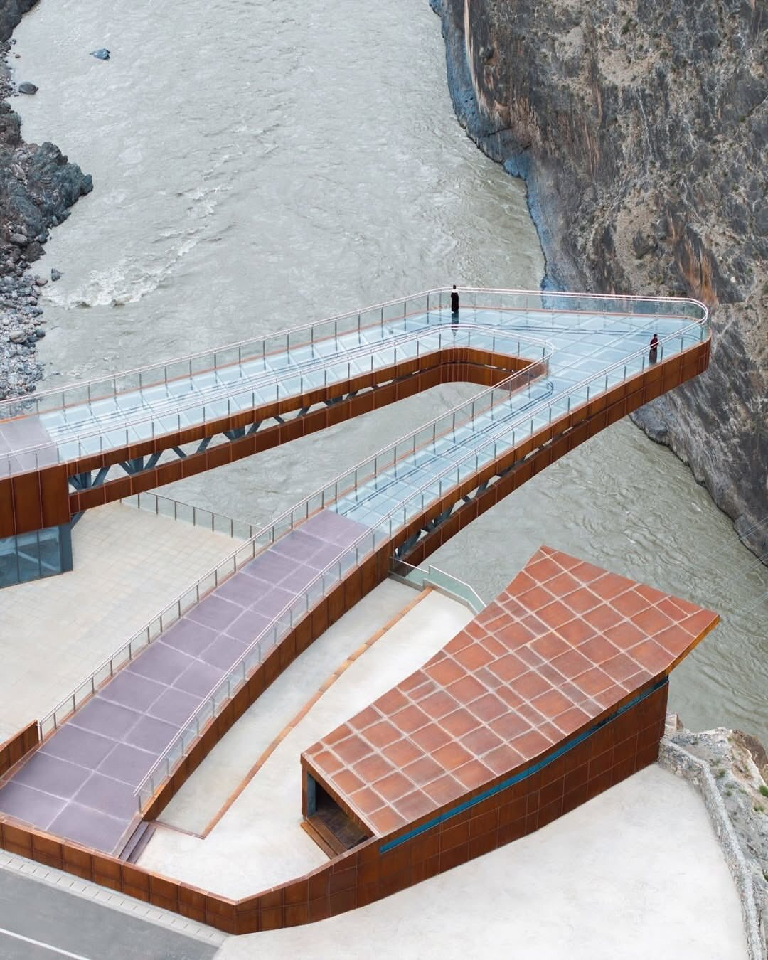 این سکوی شیشهای مرتفع روی صخرههایی به ارتفاع بیش از ۱۳۰ متر از کف دره ساخته شده و با کنسولی ۳۷ متری، فرمی U شکل و الهامگرفته از پیچهای مشهور جاده نوجیانگ را ایجاد میکند. کف شفاف این سازه تجربهای شبیه «راهی در آسمان» را برای بازدیدکنندگان رقم میزند و آنها را در چشمانداز باشکوه دره غوطهور میسازد.