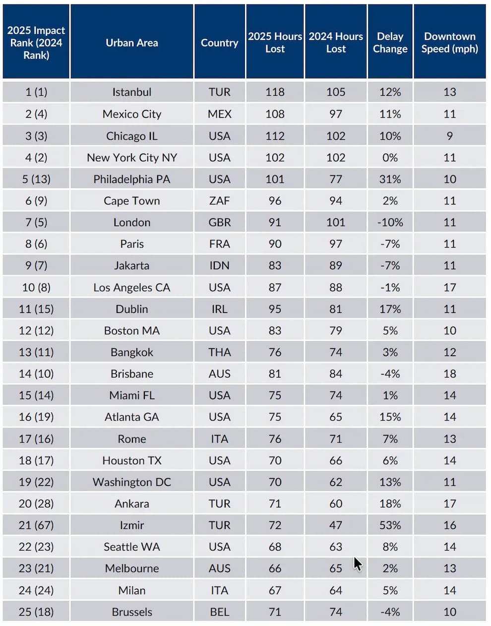 طبق نتایج منتشرشده، شهرهای بزرگ دیگری نیز در سال ۲۰۲۵ شاهد افزایش چشمگیر تأخیرهای ترافیکی بودهاند. مکزیکوسیتی و شیکاگو با از دست دادن ۱۰۸ و ۱۱۲ ساعت به ترتیب در رتبههای بعدی قرار گرفتهاند. نیویورک و فیلادلفیا نیز پنج شهر نخست فهرست را تکمیل میکنند.